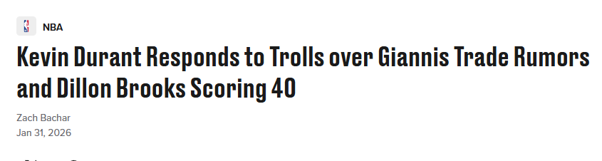 北京时间2月1日,键盘侠KD又上线了!火箭队球星杜兰特,对于自己的名字卷入字母哥与密尔沃基雄鹿队的交易流言一事,颇感意外。此外,他还回应了狄龙近日40分爆发。